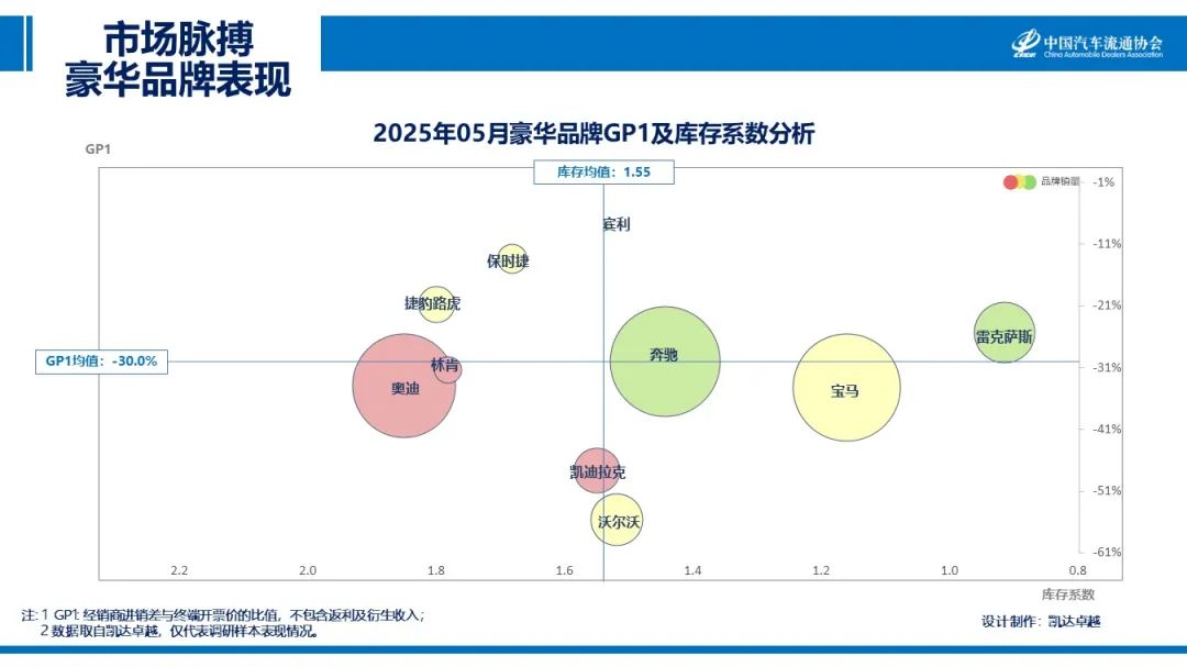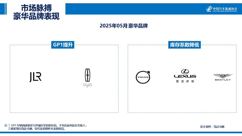 2025年05月,豪华品牌库存系数下降前三的品牌分别为沃尔沃、雷克萨斯和宾利;GP1提升的分别是捷豹路虎和林肯。