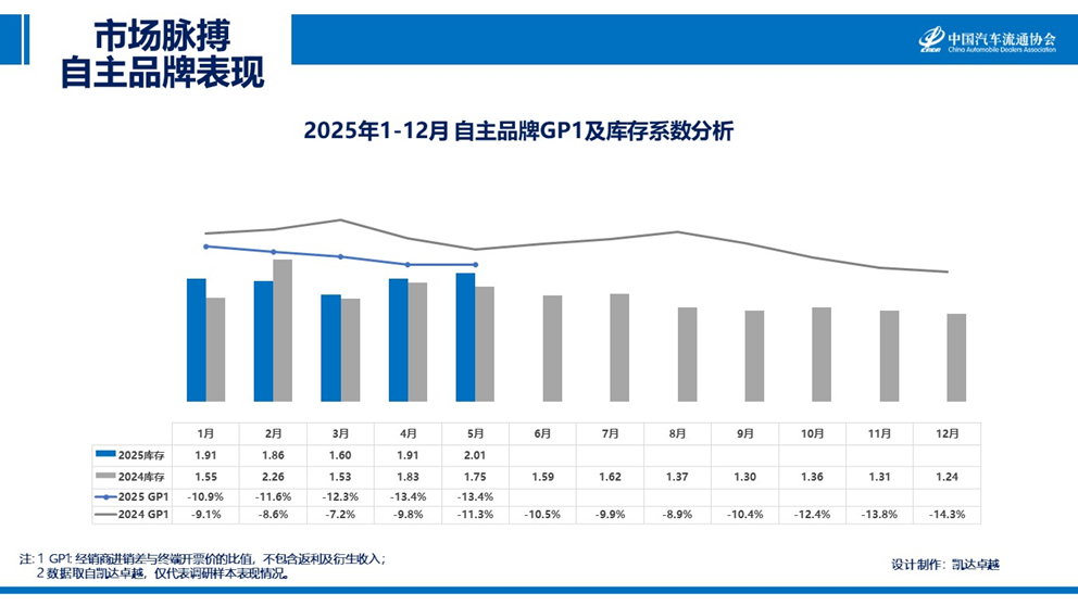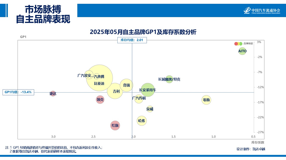 库存系数从 1.91 微升至 2.01,GP1 维持 - 13.4%。尽管自主品牌在市场份额和盈利能力方面表现较为出色,但随着市场竞争加剧,产品升级和改款上市较快,网点布局密集等风险需要警惕。车企需优化产品矩阵与技术迭代节奏,平衡创新突破与市场承接力;渠道端需要整合网点布局,破解区域资源内耗;厂商需重构批售协同逻辑,建立更灵活的供需联动机制。唯有在三者博弈中找到平衡点,才能让增长势能真正转化为可持续的行业动能。