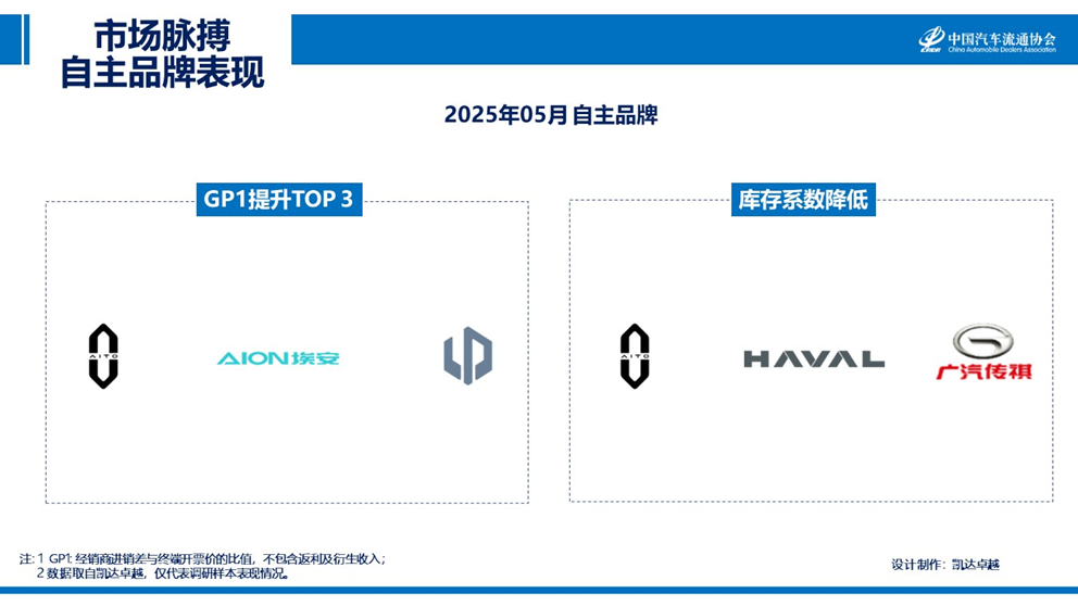 2025年05月份自主品牌中,GP1提升的前三个品牌是问界、广汽埃安和零跑;库存系数下降前三的品牌分别为问界、长城哈弗和广汽传祺。