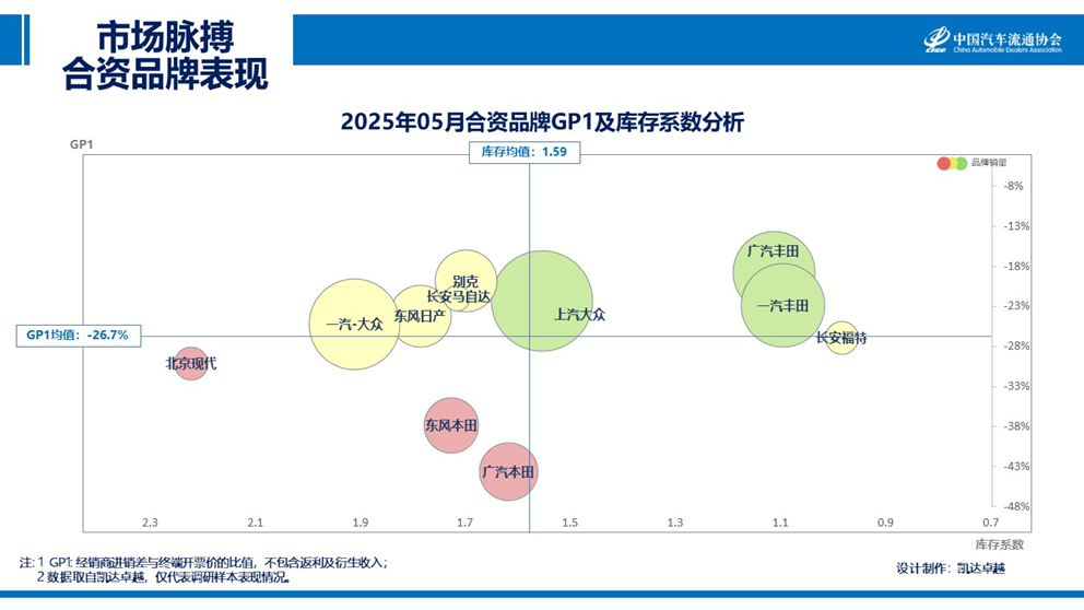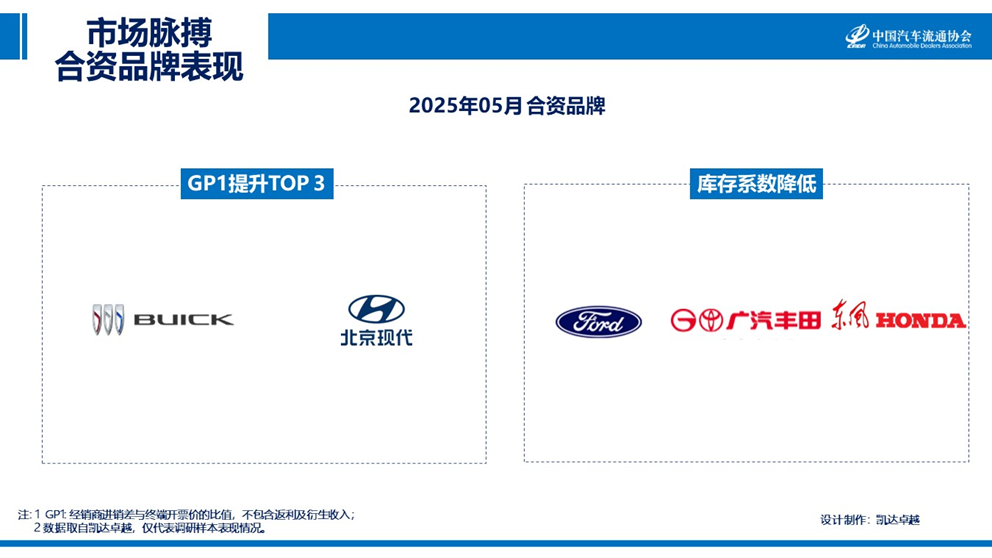 2025年05月主流合资品牌GP1提升的分别是别克和北京现代;库存系数下降前三的品牌分别为长安福特、广汽丰田和东风本田。
